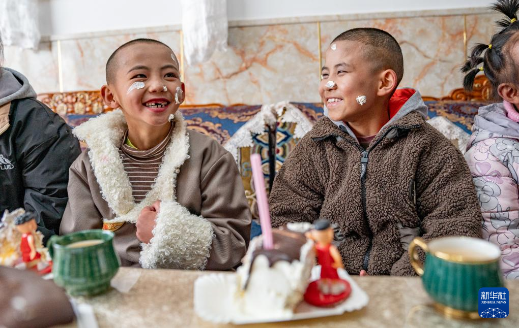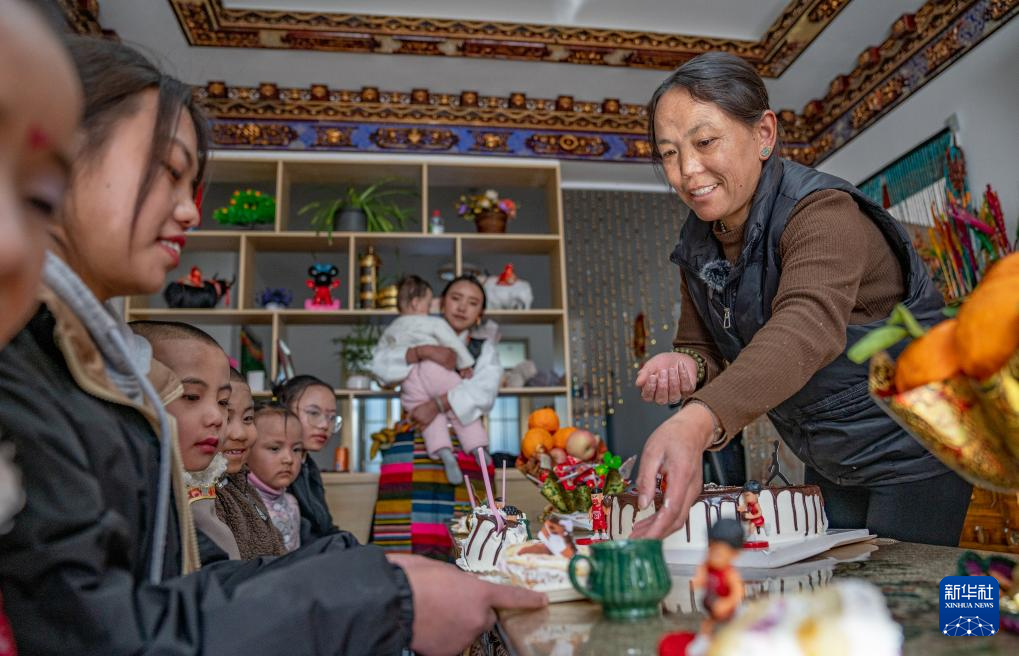 按惯例,今天是福利院孩子们吃新年蛋糕的日子。一首《新年好》唱罢,孩子们开心地吹灭蜡烛,吃起了蛋糕。今年也是巴桑在这个“家”里度过的第18个藏历农家新年。