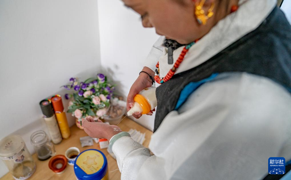 1月8日,爱心妈妈旦增卓玛在摆放切玛(五谷斗)。