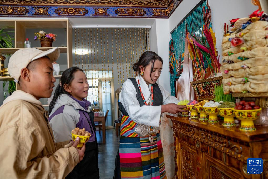 1月8日,爱心妈妈旦增卓玛和孩子们摆放新年供品。