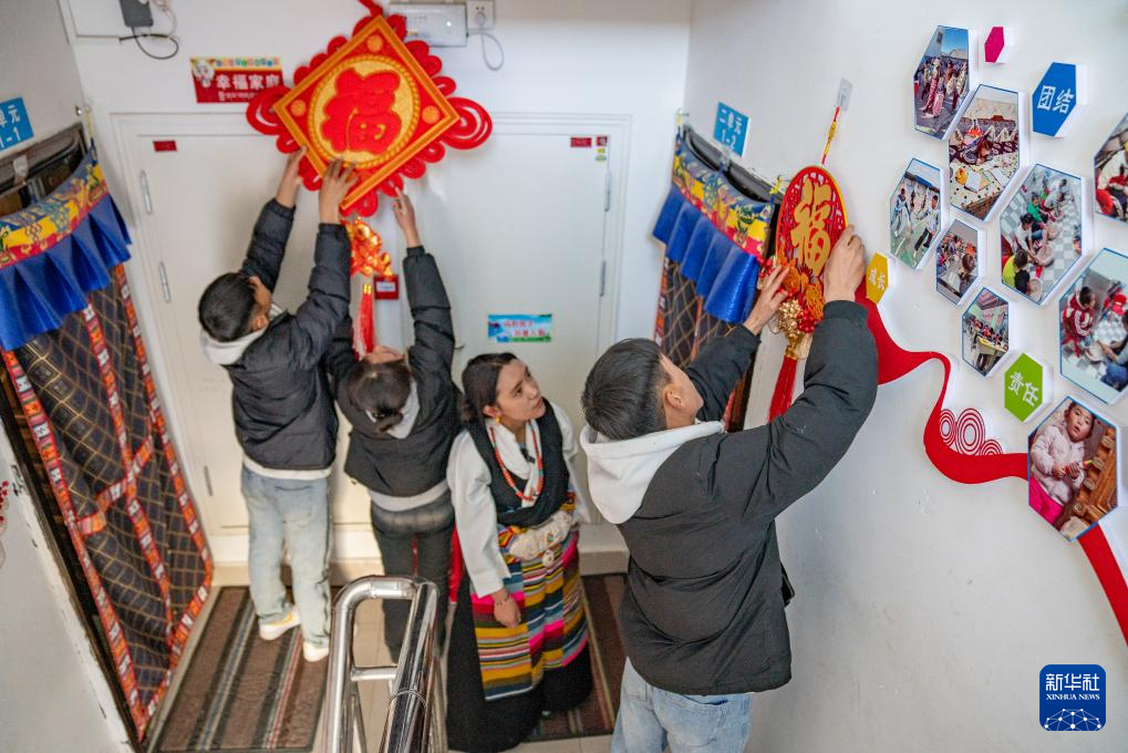 1月8日,爱心妈妈旦增卓玛和孩子们在装饰走廊。