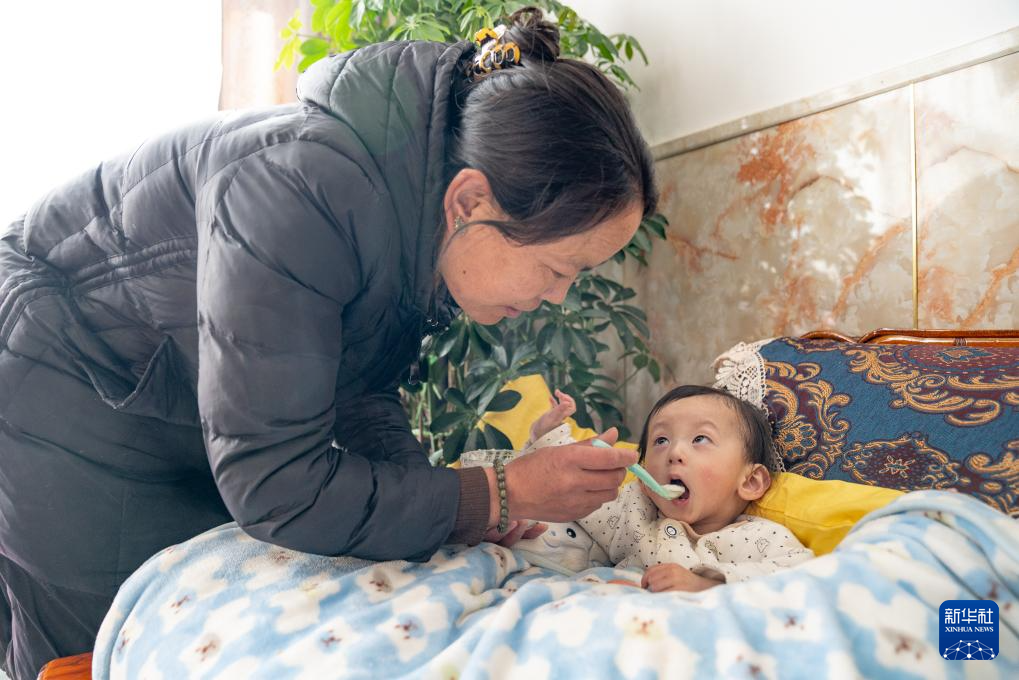 1月8日,爱心妈妈巴桑在给一岁半的拉巴扎西喂饭。