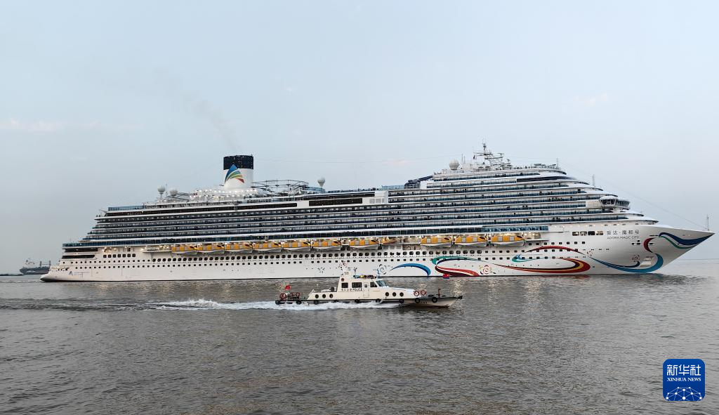 2024年1月1日,国产首艘大型邮轮“爱达·魔都号”开启商业首航,长江航运公安局上海分局公安艇在进行护航。