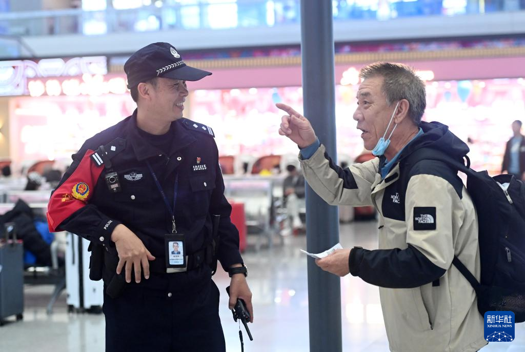 1月8日,高明伟在南宁东站向一名身份证失而复得的旅客讲解出行安全有关问题。