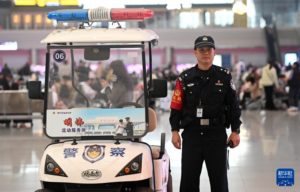 1月8日,高明伟(右)和同事在南宁东站执勤。