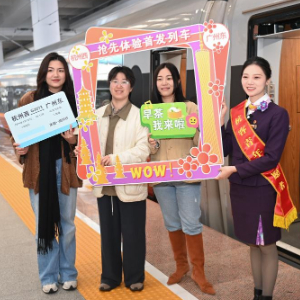 1月10日,在杭州西站,旅客与杭州客运段高铁五车队乘务员在杭州西站直达广州东站的G3073次高铁列车前合影。