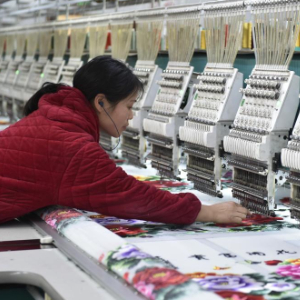 1月9日,汝州市汝绣产业园一家机绣企业的工人在生产车间内作业。