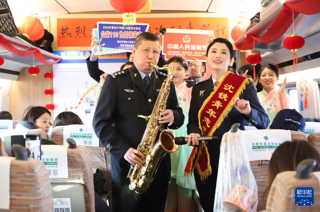1月10日,沈阳铁路公安局沈阳公安处乘警支队民警在列车上为旅客表演节目。
