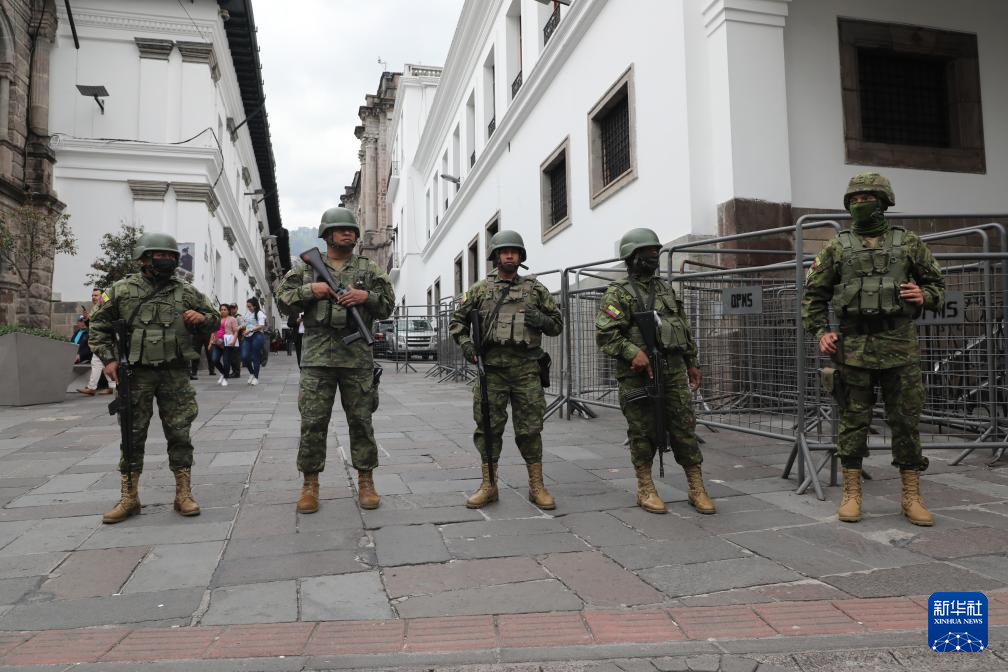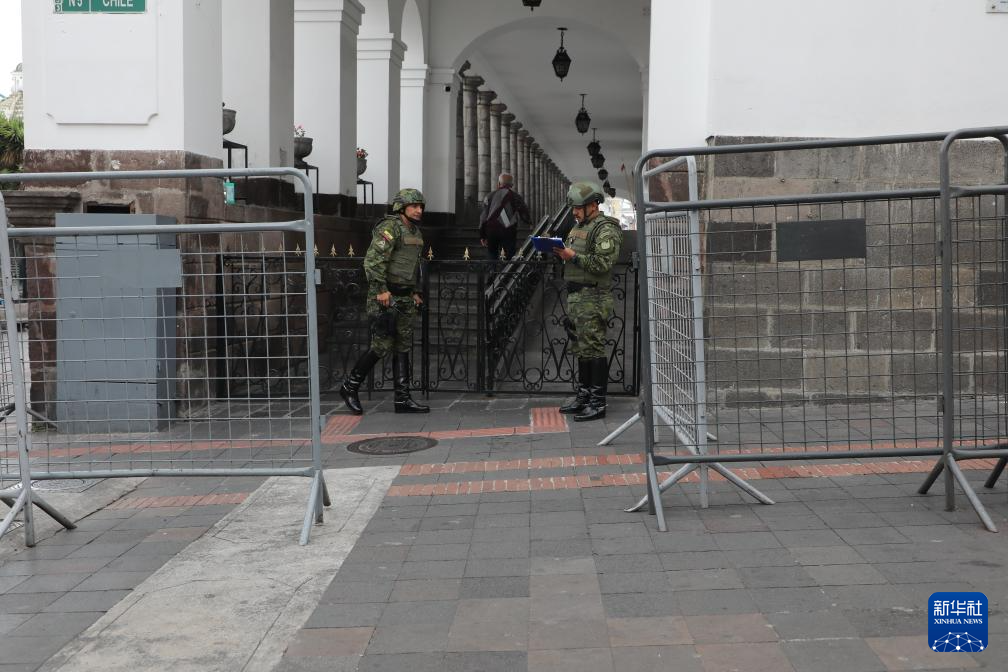 1月9日,厄瓜多尔军方人员在位于首都基多的总统府外执勤。