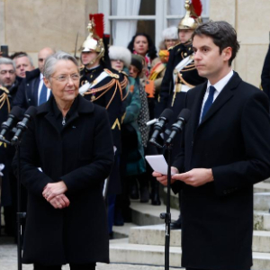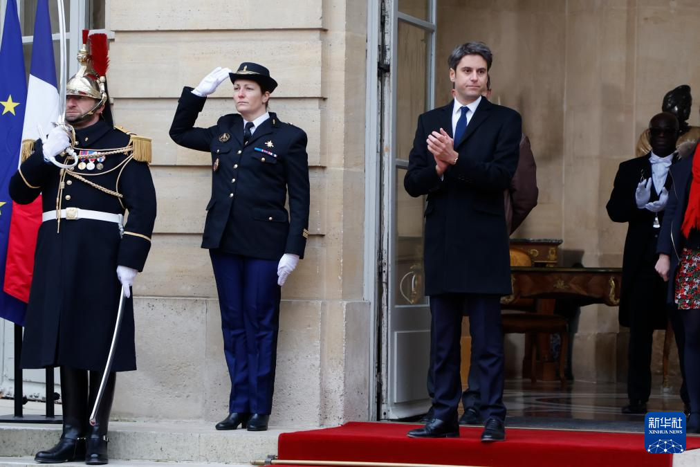 1月9日,加布里埃尔·阿塔尔(前右)在法国巴黎总理府举行的权力交接仪式上致辞。
