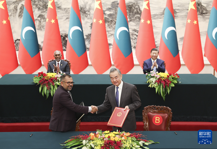 1月10日下午,国家主席习近平在北京人民大会堂同来华进行国事访问的马尔代夫总统穆伊兹举行会谈。这是会谈后,两国元首共同见证签署双边合作文件。