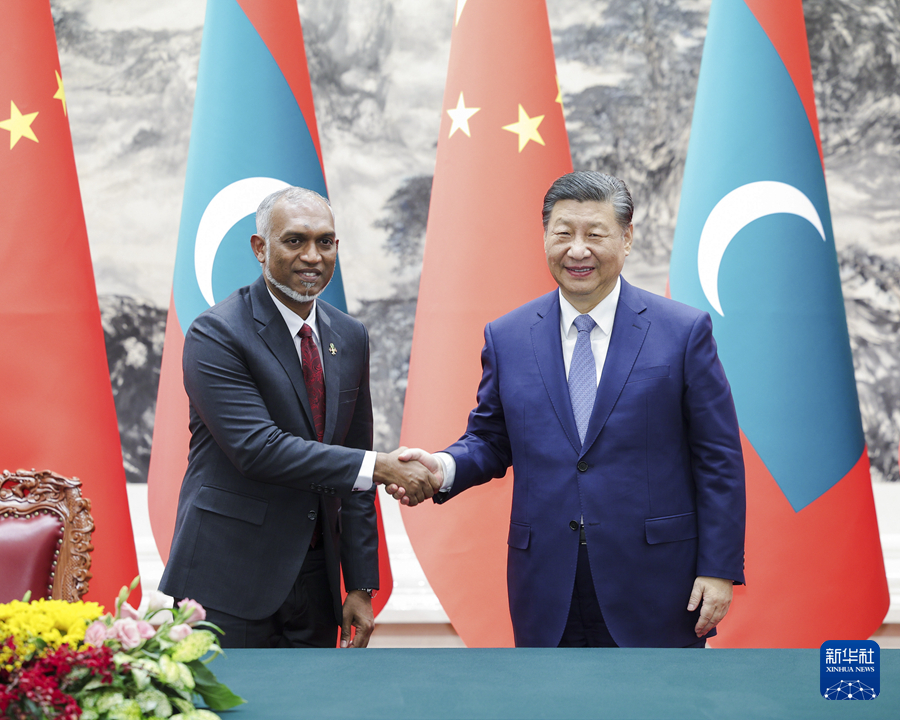 1月10日下午,国家主席习近平在北京人民大会堂同来华进行国事访问的马尔代夫总统穆伊兹举行会谈。