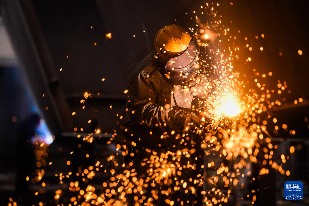 1月9日,在江西省宜春市袁州区锦峰重工科技有限公司,工人在钢箱桥生产线上进行焊接作业。