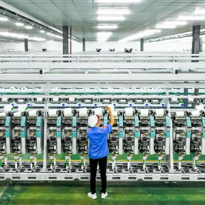 1月10日,在江西省九江市德安县的江西亿阳纺织集团有限公司自动化车间内,工人在给布卷生产设备接线。