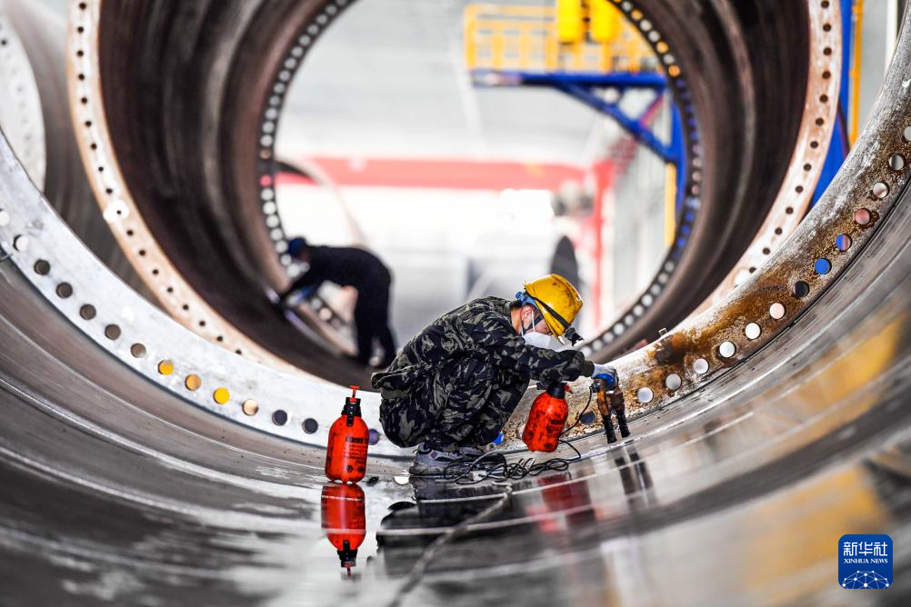 1月9日,在江西省宜春市袁州区锦峰重工科技有限公司,工人在检测风电塔筒的焊缝质量。