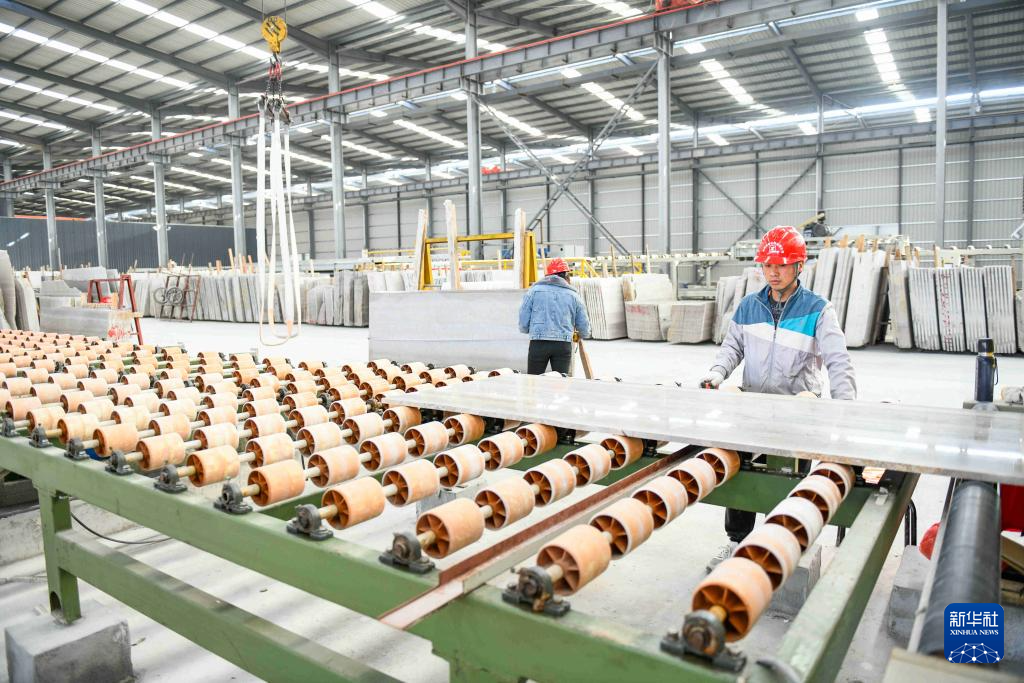1月9日,工人在贵州省黔西南布依族苗族自治州安龙县工业园区内的一家石材企业加工木纹石。
