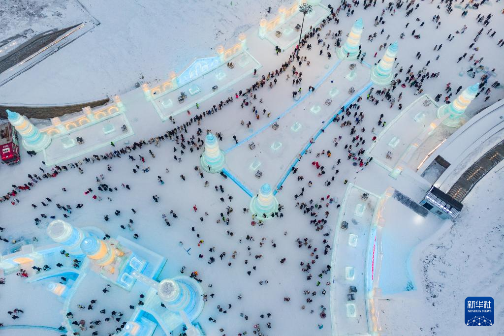 游客在哈尔滨冰雪大世界游玩(无人机照片,1月5日摄)。