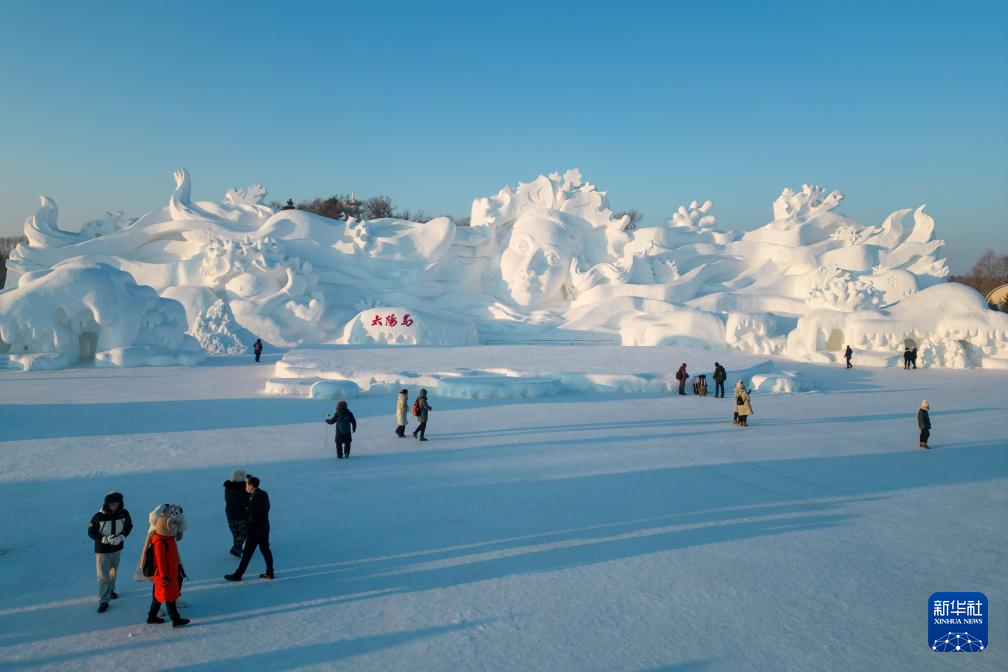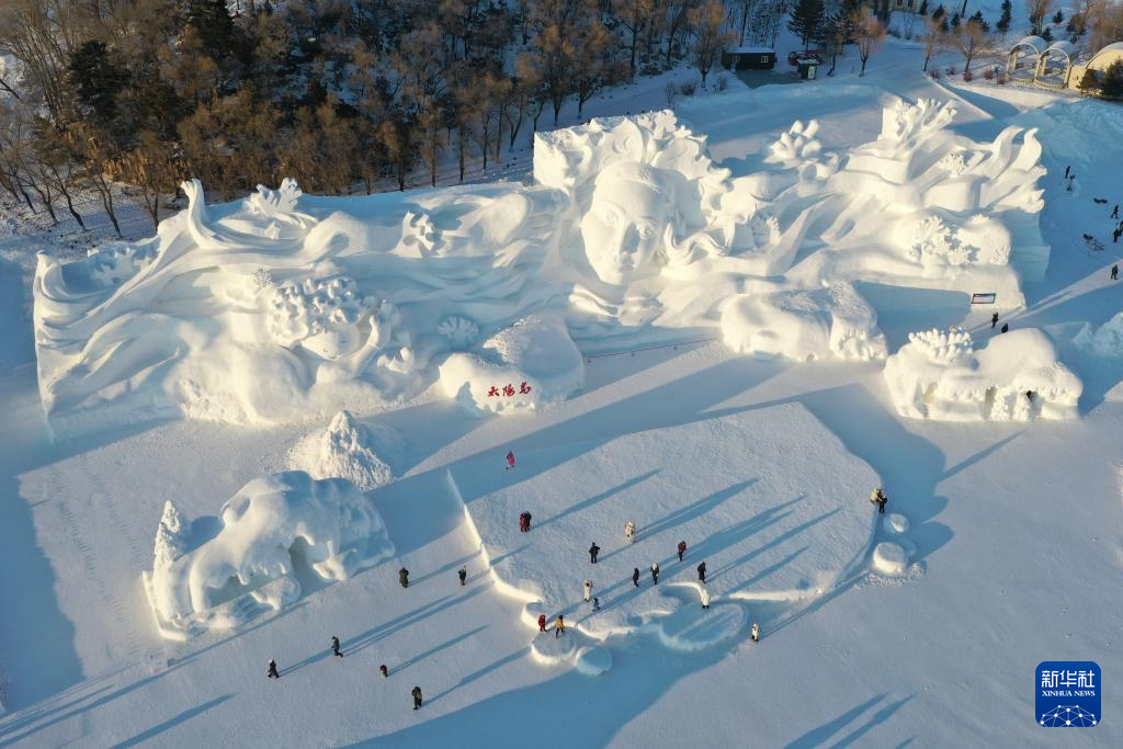 游客在哈尔滨太阳岛雪博会主塑《雪绒花》旁游玩(无人机照片,1月9日摄)。