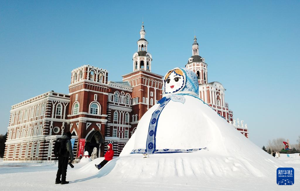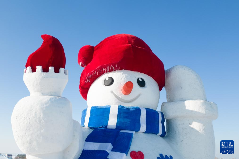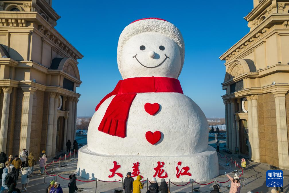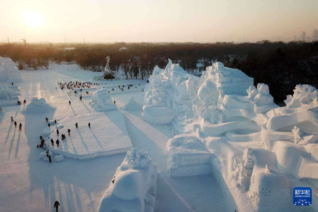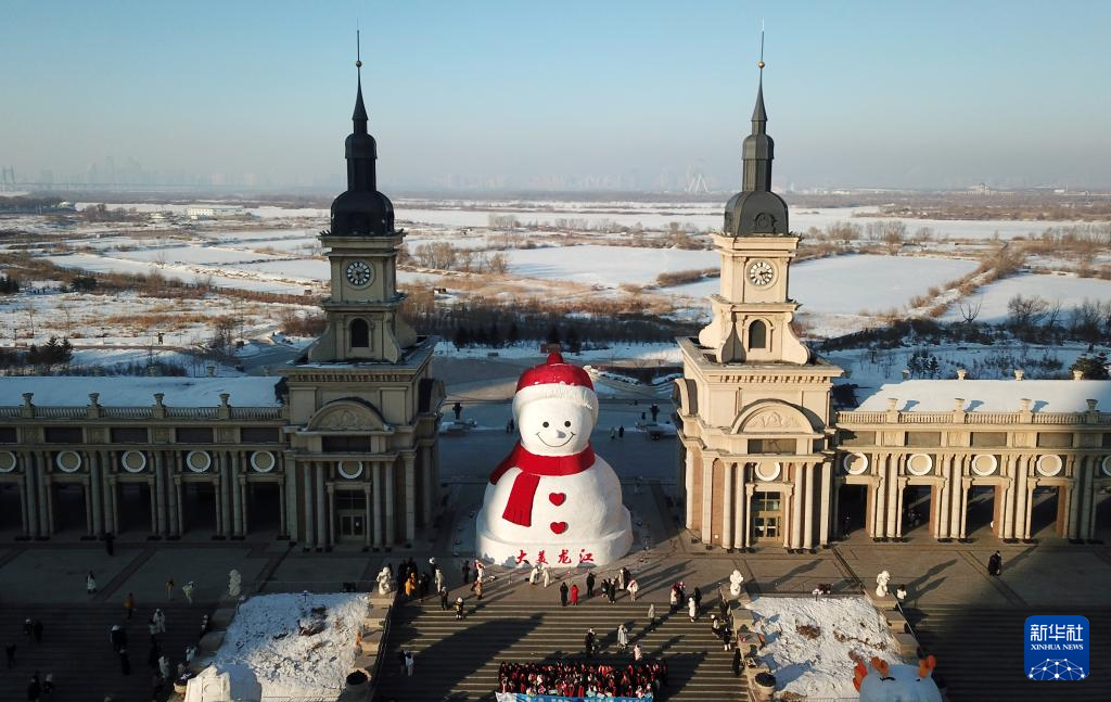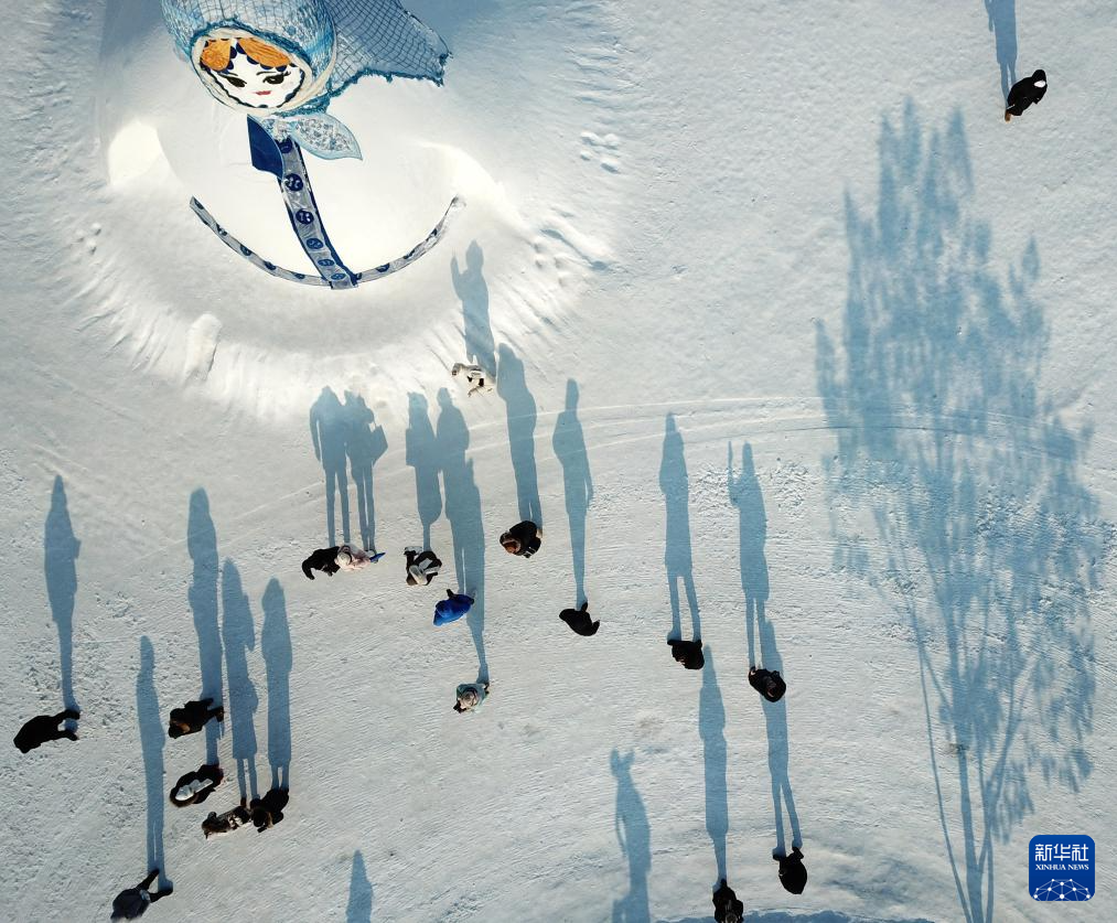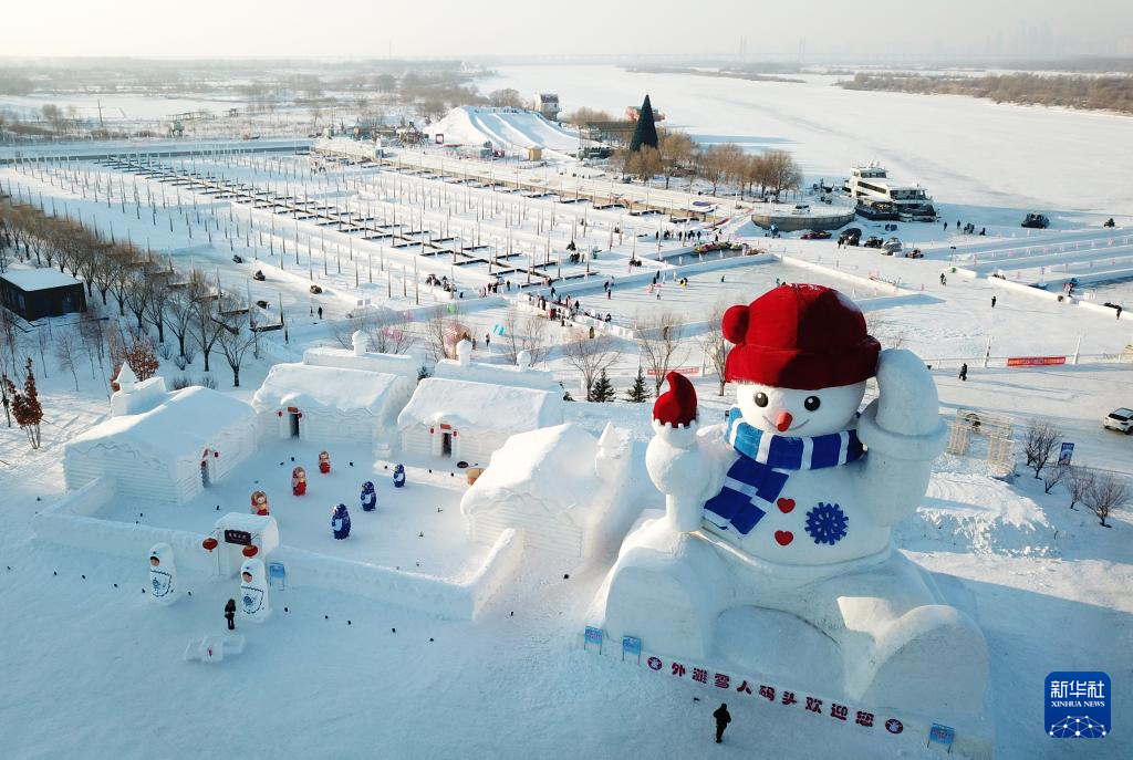 在哈尔滨群力音乐公园,游客参观“网红”大雪人(无人机照片,1月9日摄)。