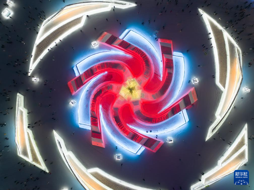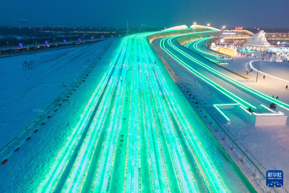 游客在哈尔滨冰雪大世界园区体验超级冰滑梯(无人机照片,1月1日摄)。
