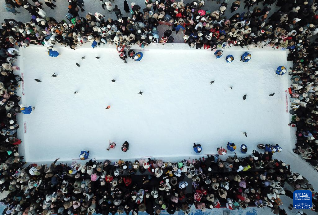 游客在哈尔滨极地公园广场观看企鹅巡游(无人机照片,1月5日摄)。