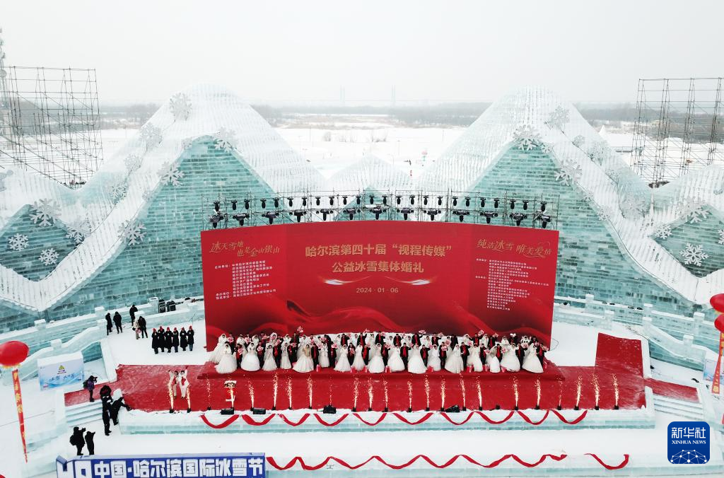 新人在哈尔滨冰雪大世界园区参加集体婚礼(无人机照片,1月6日摄)。