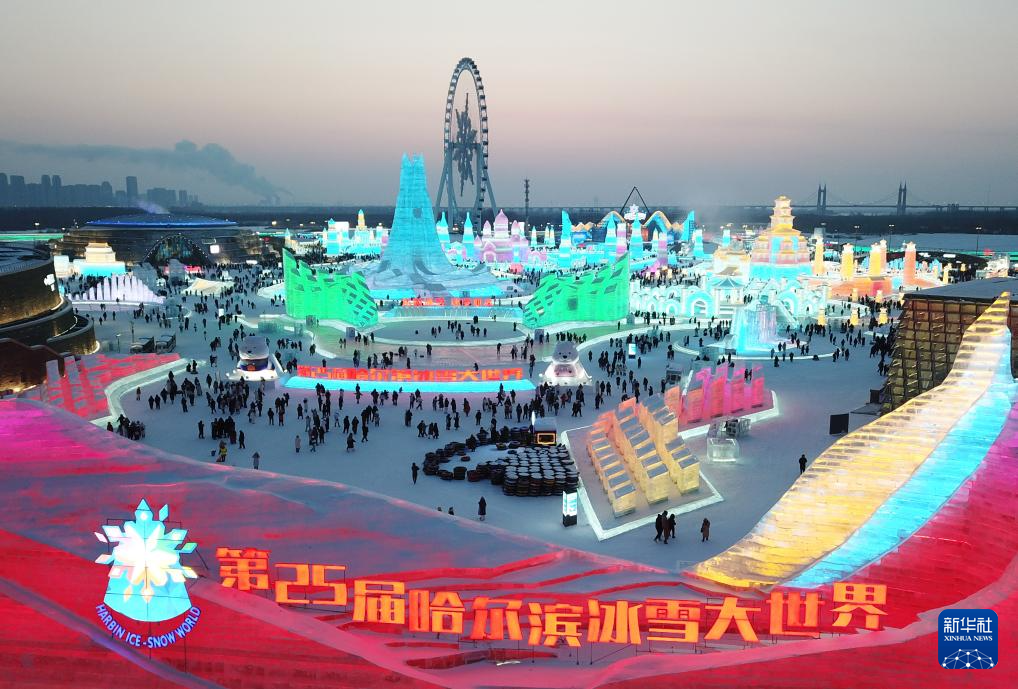 这是1月1日拍摄的第25届哈尔滨冰雪大世界园区中的巨型冰雕景观(无人机照片)。