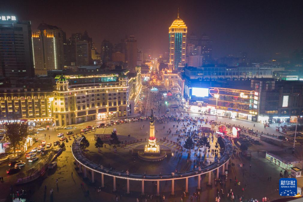 在哈尔滨市道里区,游客在中央大街附近游玩(无人机照片,1月3日摄)。