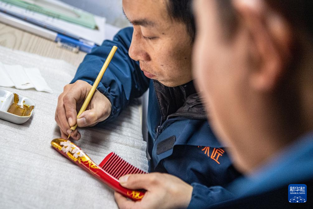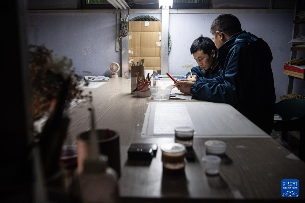 在重庆万州谭木匠木梳非遗工坊内,崔国文(左)在师父俞达洪的指导下进行大漆工艺创作(1月5日摄)。