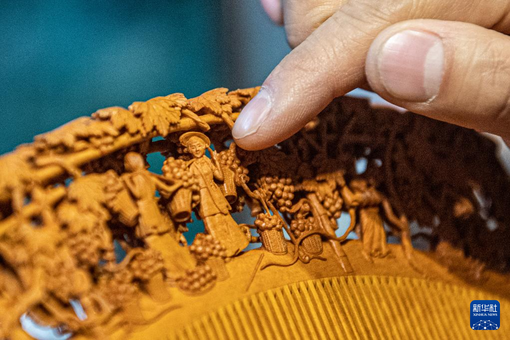 在重庆万州谭木匠木梳非遗工坊内,俞达洪在展示自己的雕刻梳作品“丰收”(1月5日摄)。