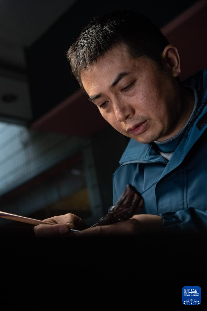 在重庆万州谭木匠木梳非遗工坊内,俞达洪在进行雕刻工艺创作(1月5日摄)。