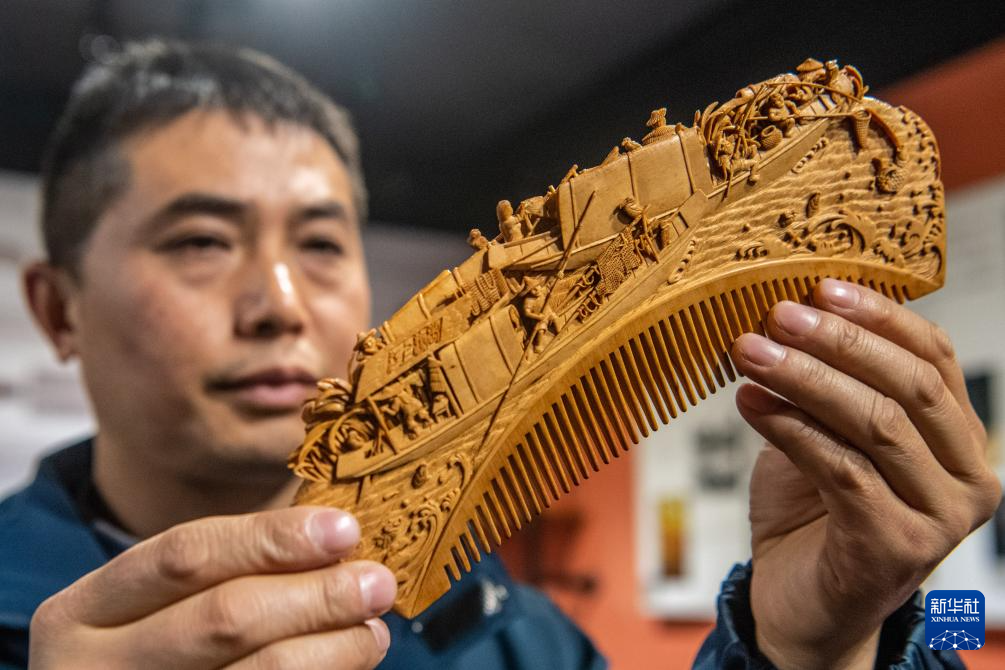 在重庆万州谭木匠木梳非遗工坊内,俞达洪在展示自己的雕刻梳作品“江上渔者”(1月5日摄)。