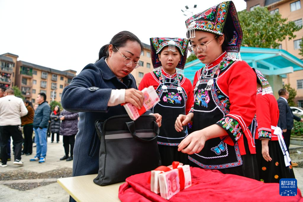 1月11日,贵州省龙里县冠山街道奋进社区易地扶贫搬迁户在帮忙准备分红金。