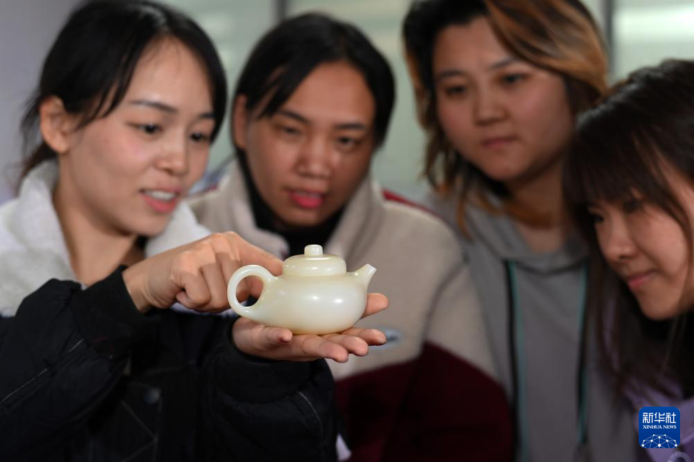 1月12日,工人在贵州省黔南布依族苗族自治州罗甸县工业园区一家玉石产品生产企业观赏刚加工出来的玉壶。