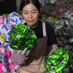 1月12日,工人在贵州省黔南布依族苗族自治州罗甸县工业园区一家足球生产企业分拣生产足球的材料。