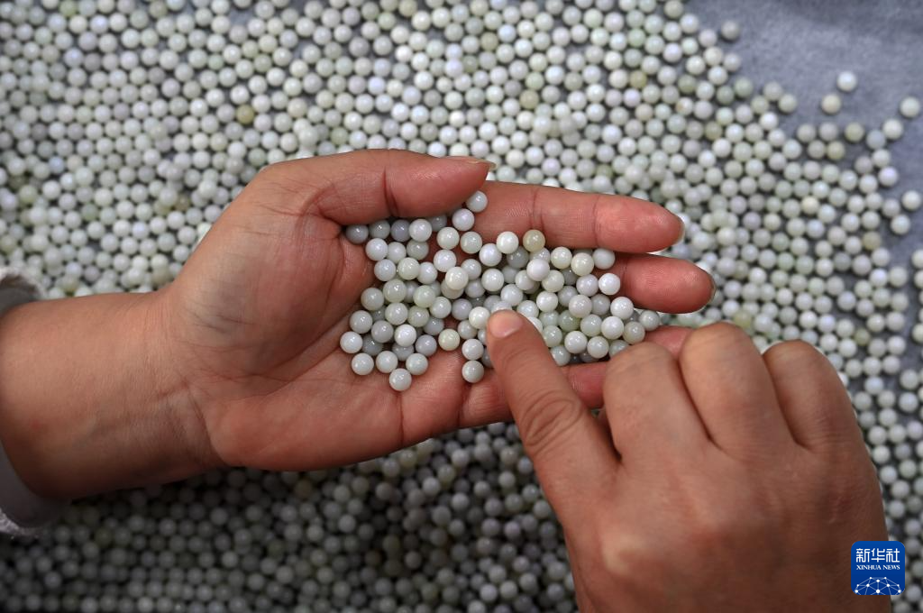 1月12日,工人在贵州省黔南布依族苗族自治州罗甸县工业园区一家玉石产品生产企业分拣加工挂件的玉珠。
