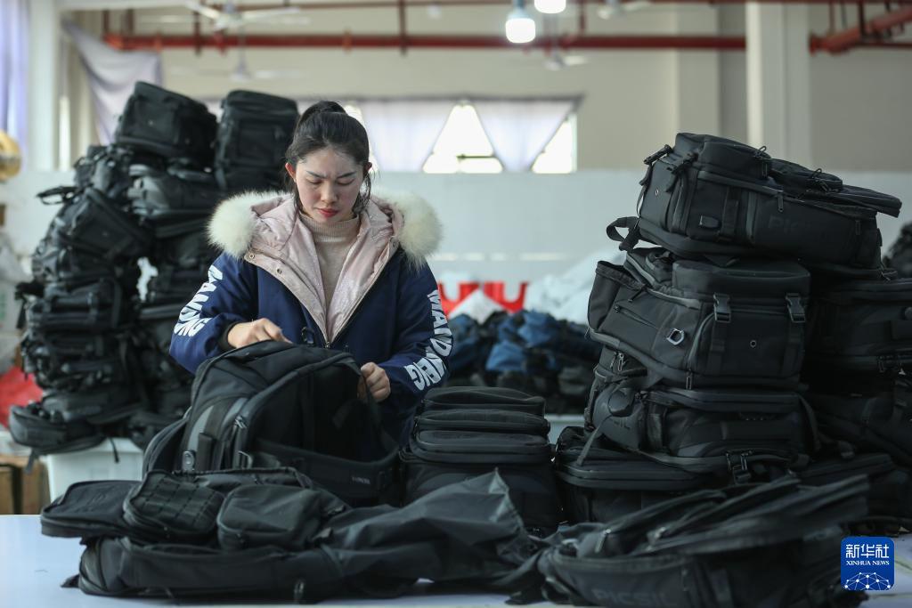 1月12日,工人在贵州省黔南布依族苗族自治州罗甸县工业园区一家箱包生产企业检查箱包成品。