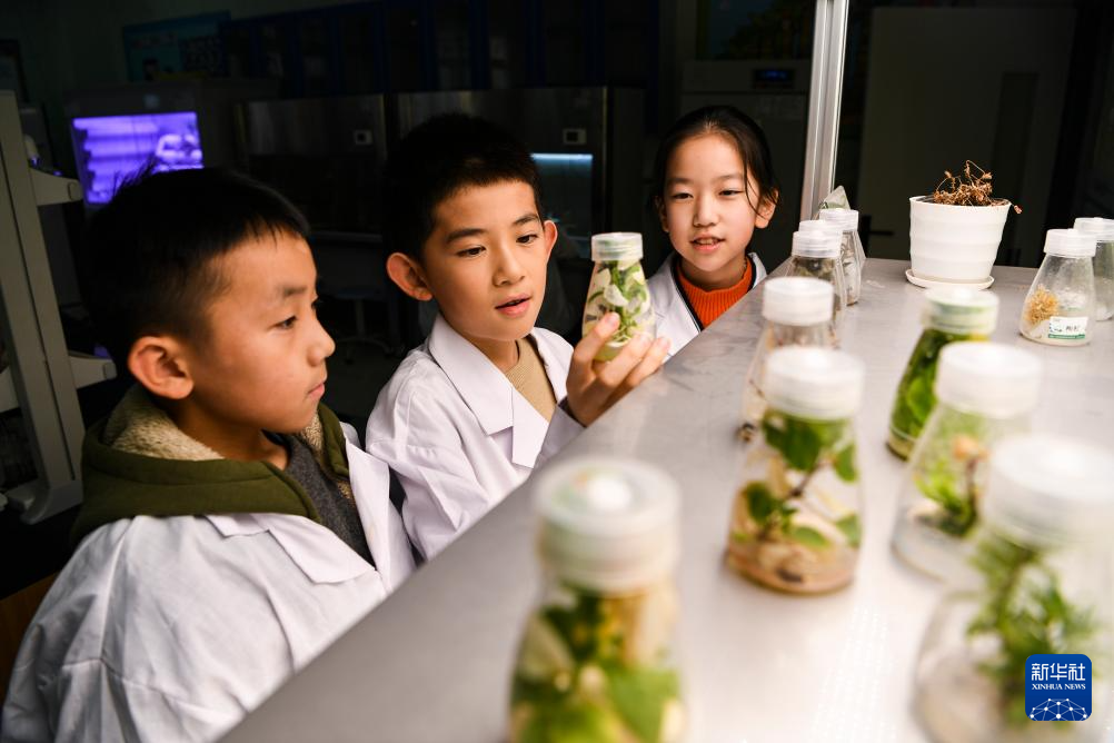 1月11日,重庆市人民小学生物实验社团学生在观察无菌苗生长状态。