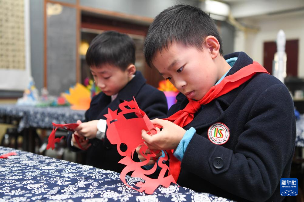 1月11日,重庆市巴蜀小学美术社团学生在练习剪纸。
