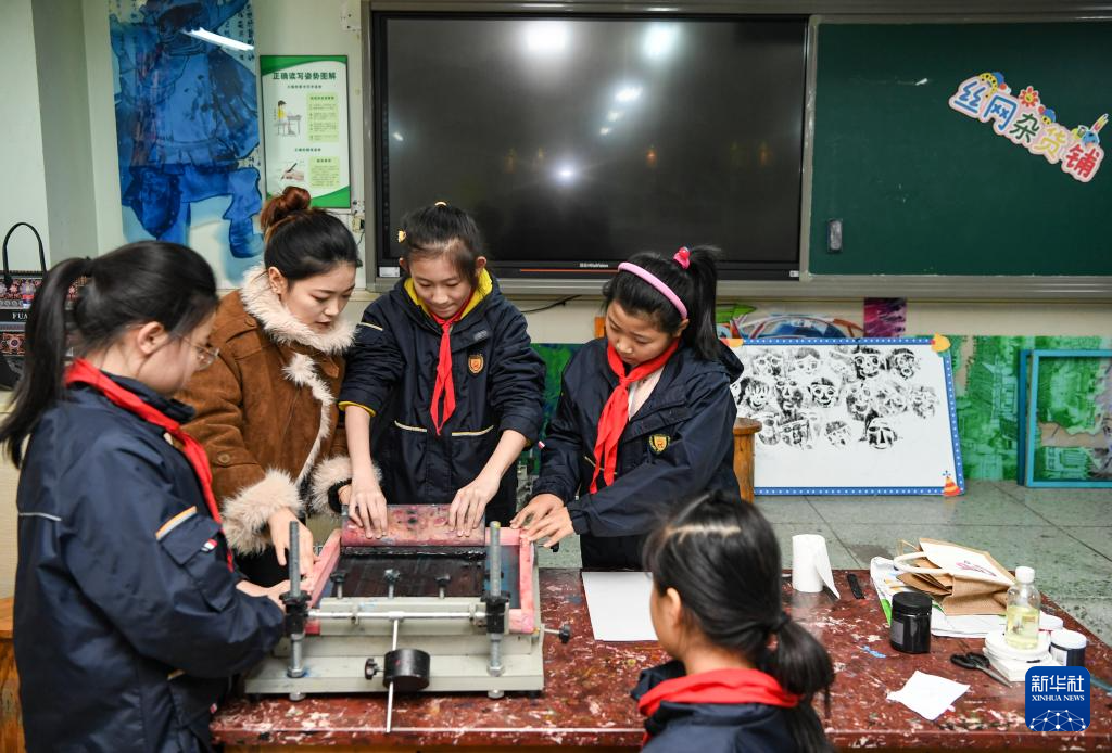 1月11日,重庆市人民小学丝印版画社团学生在老师指导下创作丝印版画。