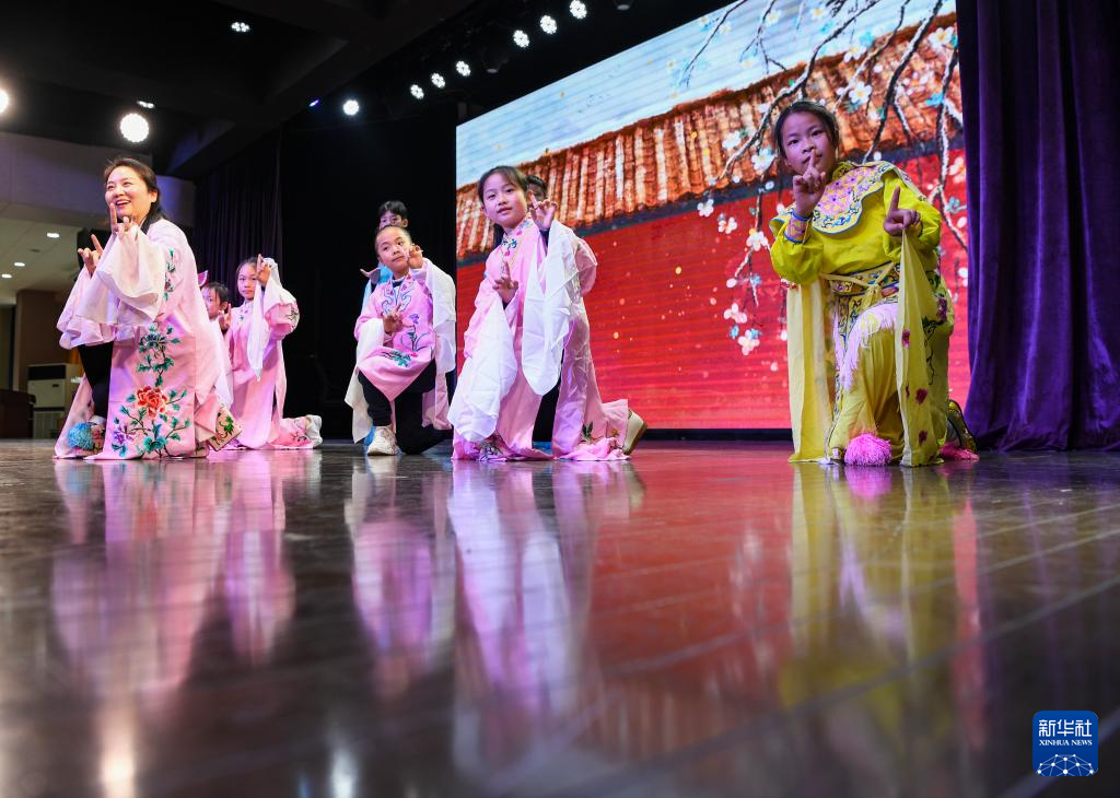 1月11日,重庆市人民小学戏曲社团学生在老师指导下练习京剧。