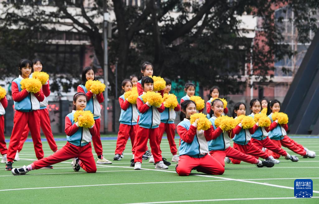 1月11日,重庆市渝中区人和街小学啦啦操社团学生在训练。