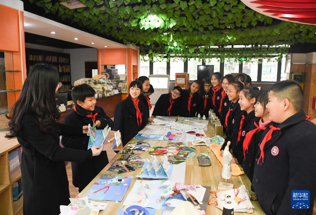 1月11日,重庆市巴蜀小学创意设计社团学生(左二)介绍自己的创意设计作品。