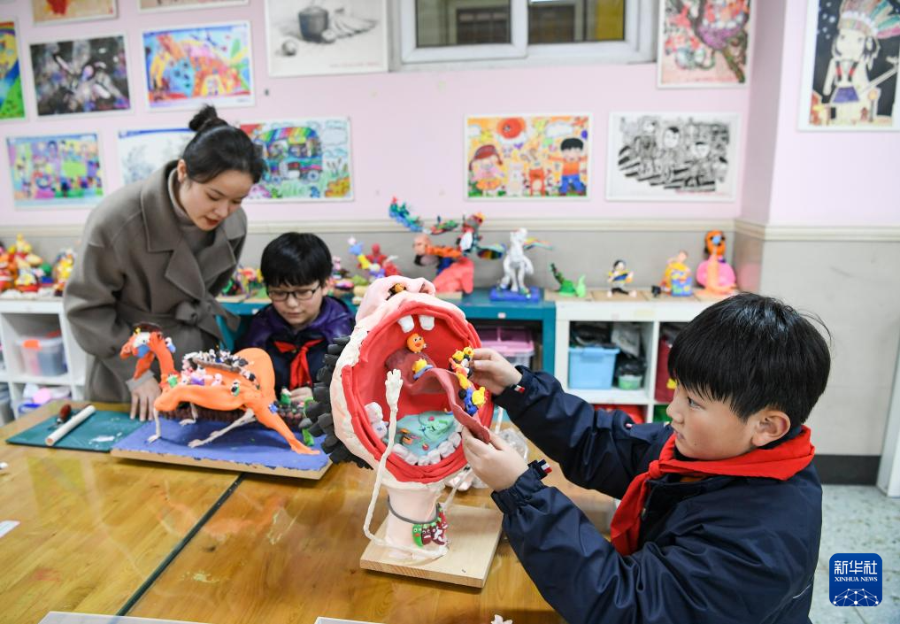1月11日,重庆市人民小学雕塑社团学生在创作雕塑作品。