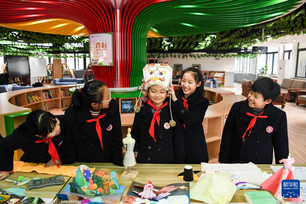 1月11日,重庆市巴蜀小学创意设计社团学生(右二)将自己的创意设计作品戴在同学头上。