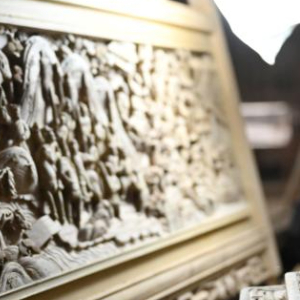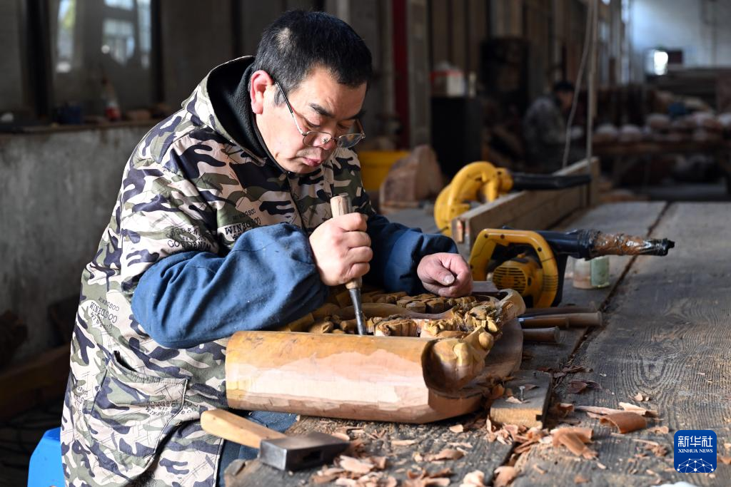 1月11日,在黄山徽匠园林古建有限公司,工作人员在制作徽派仿古建筑配件。