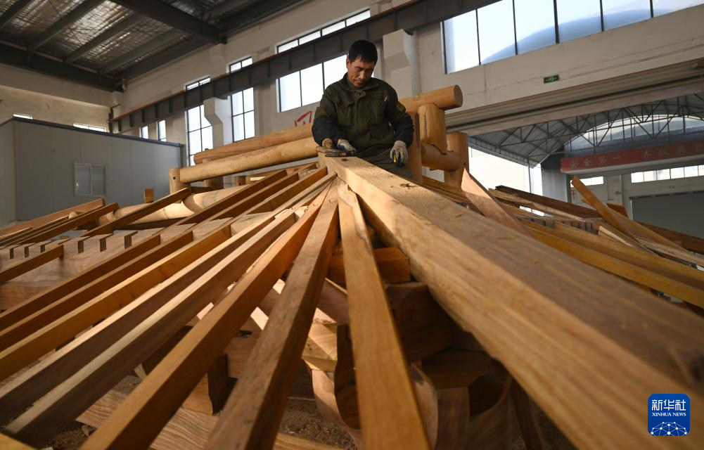 1月11日,在位于黄山市的安徽大学士建设有限公司,工作人员在搭建徽派仿古建筑。