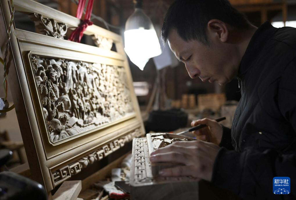 1月12日,在安徽省黄山市歙县精华园旅游投资有限公司,工作人员在制作徽派仿古建筑配件。