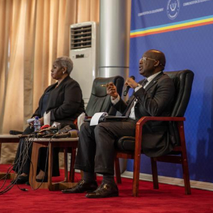 1月13日,在刚果(金)首都金沙萨,刚果(金)副总理兼外长卢通杜拉(右)与联合国秘书长刚果(金)问题特别代表兼联刚稳定团团长凯塔出席联合记者会。