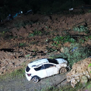 这张由哥伦比亚乔科省省长办公室1月13日提供的照片显示,汽车被山体滑坡毁坏。