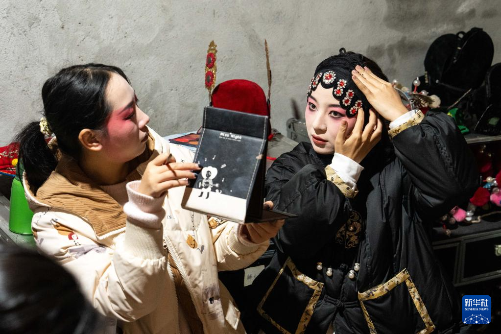 1月15日,在伊塘镇长木塘村,演员在后台做演出前的准备工作。